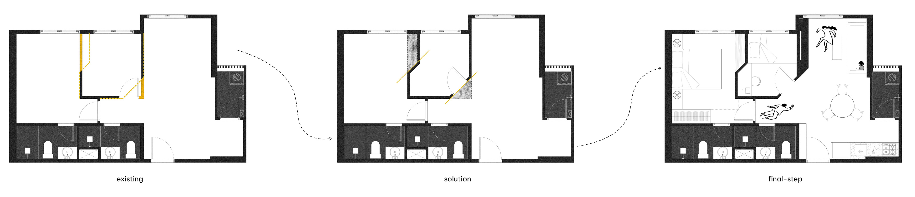 A two-bedroom apartment with a compact footprint of just 50 square metres is designed to accommodate a family of three. The design strategy prioritises minimal intervention with maximum impact, optimising spatial efficiency while limiting structural changes. Angled 45-degree lines are introduced into the plan to strategically expand necessary areas and compress residual, underutilised spaces.