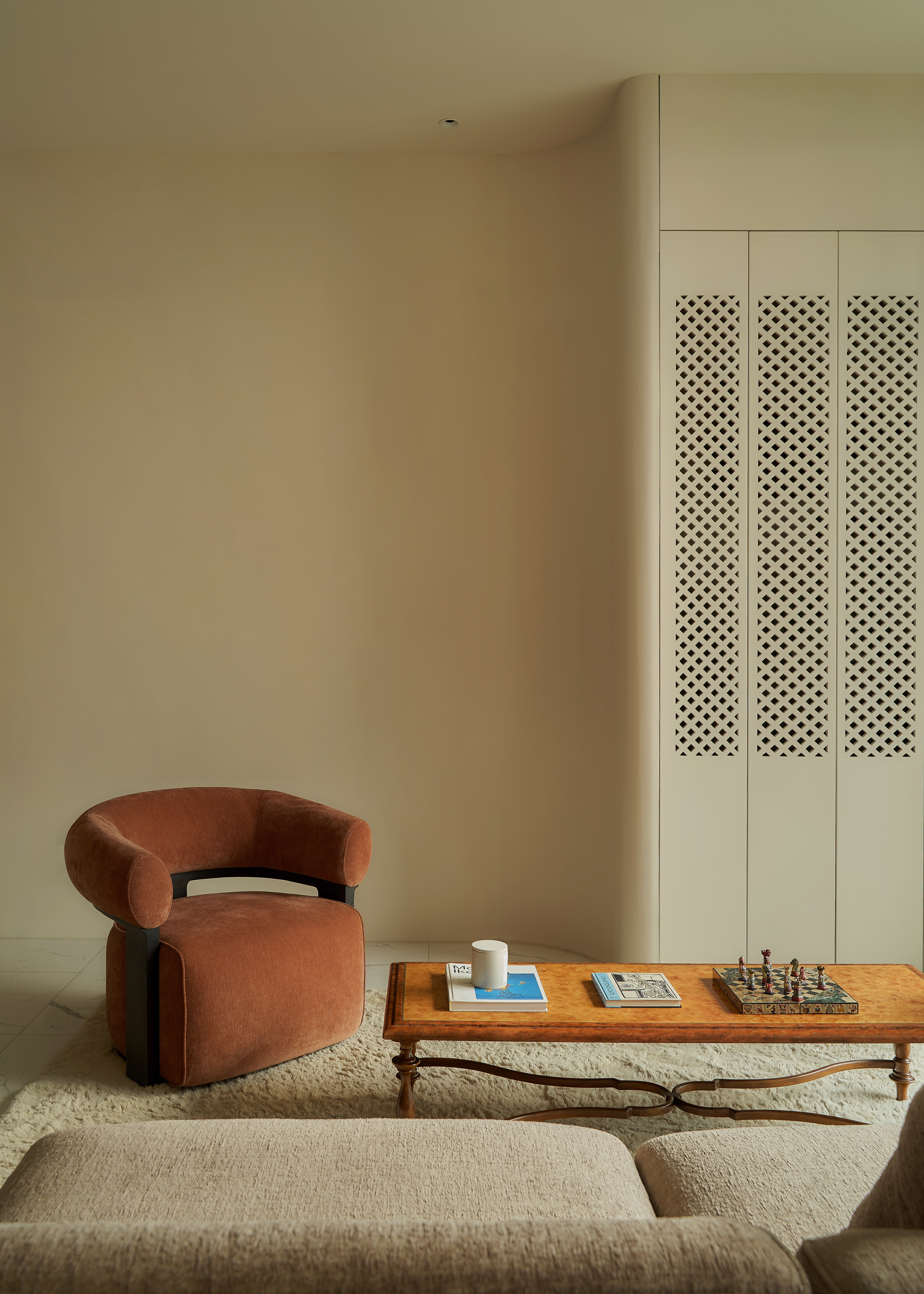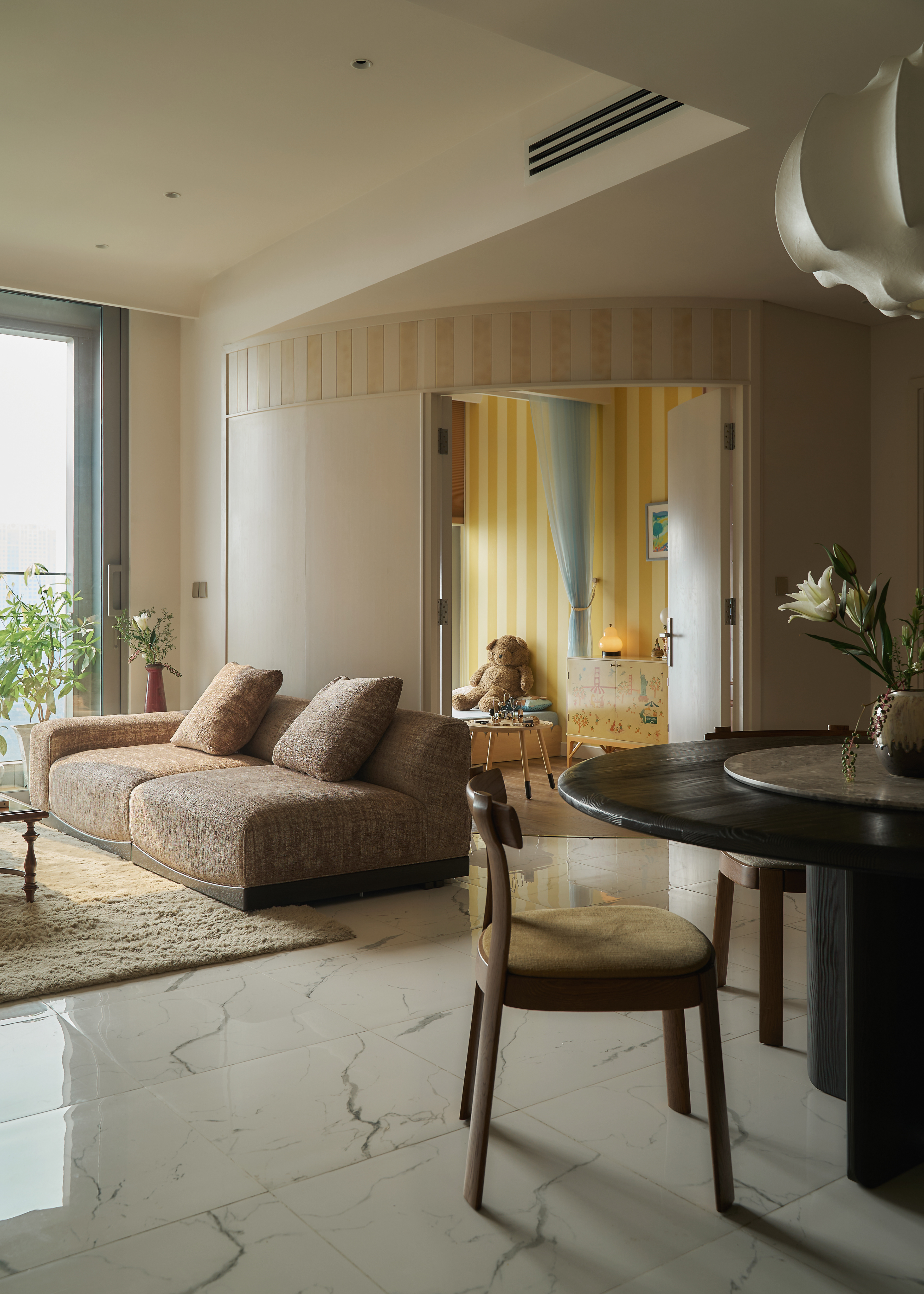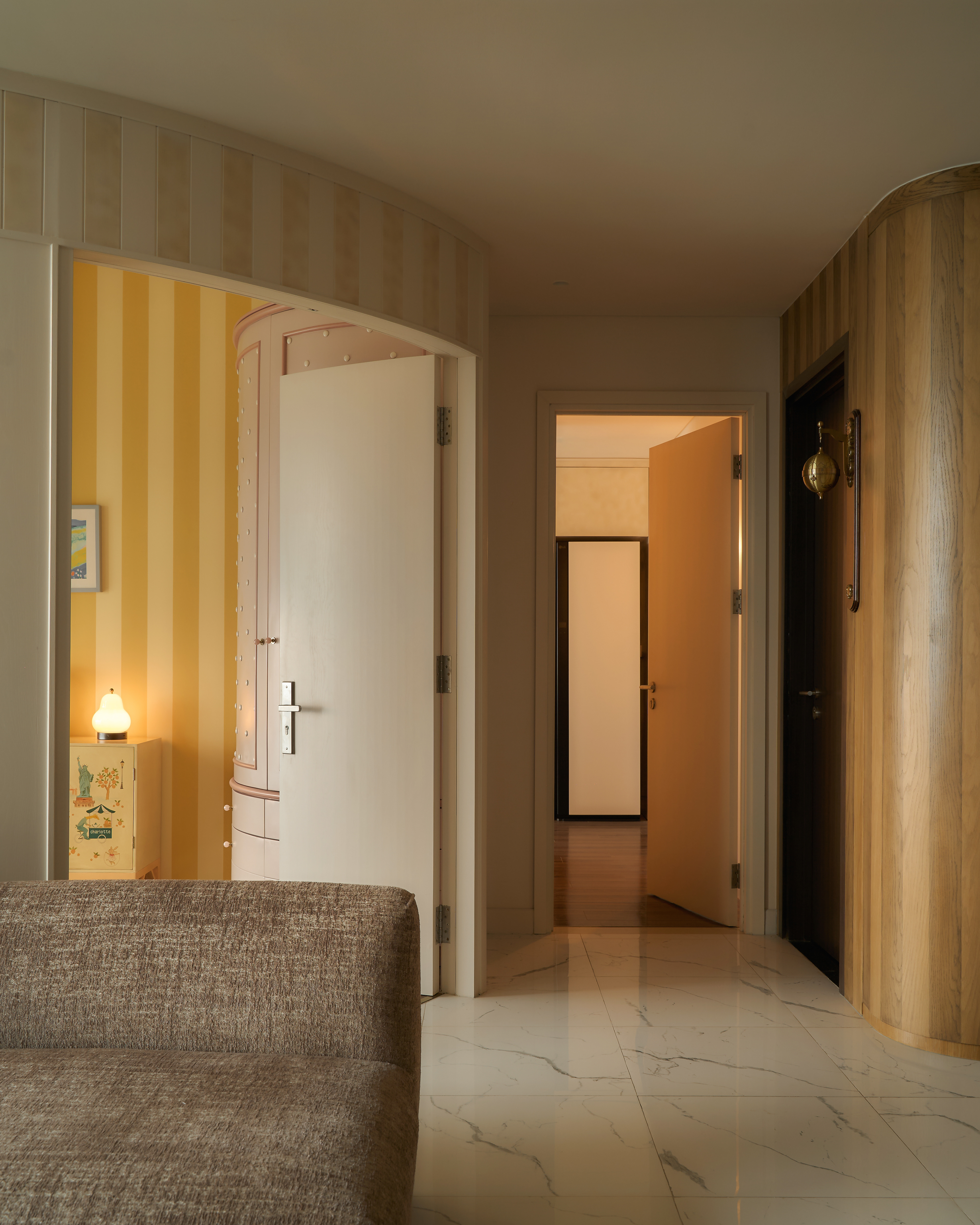 oh.hi studio approached the project within a context that required reconciling a family’s rapidly shifting daily life - especially with the arrival of a new member - and the inherent spatial limitations of the apartment. The rigid, pre-divided layout unintentionally became an obstacle, imposing overly clear boundaries on even the most basic functions. Therefore, intervening in the “communicative” walls became the primary strategy before aesthetic considerations were introduced. Curves and rounded edges replaced the original sharp corners, forming a system of adaptable partitions that shift with daily activities while simultaneously softening the spatial intersections within the home.