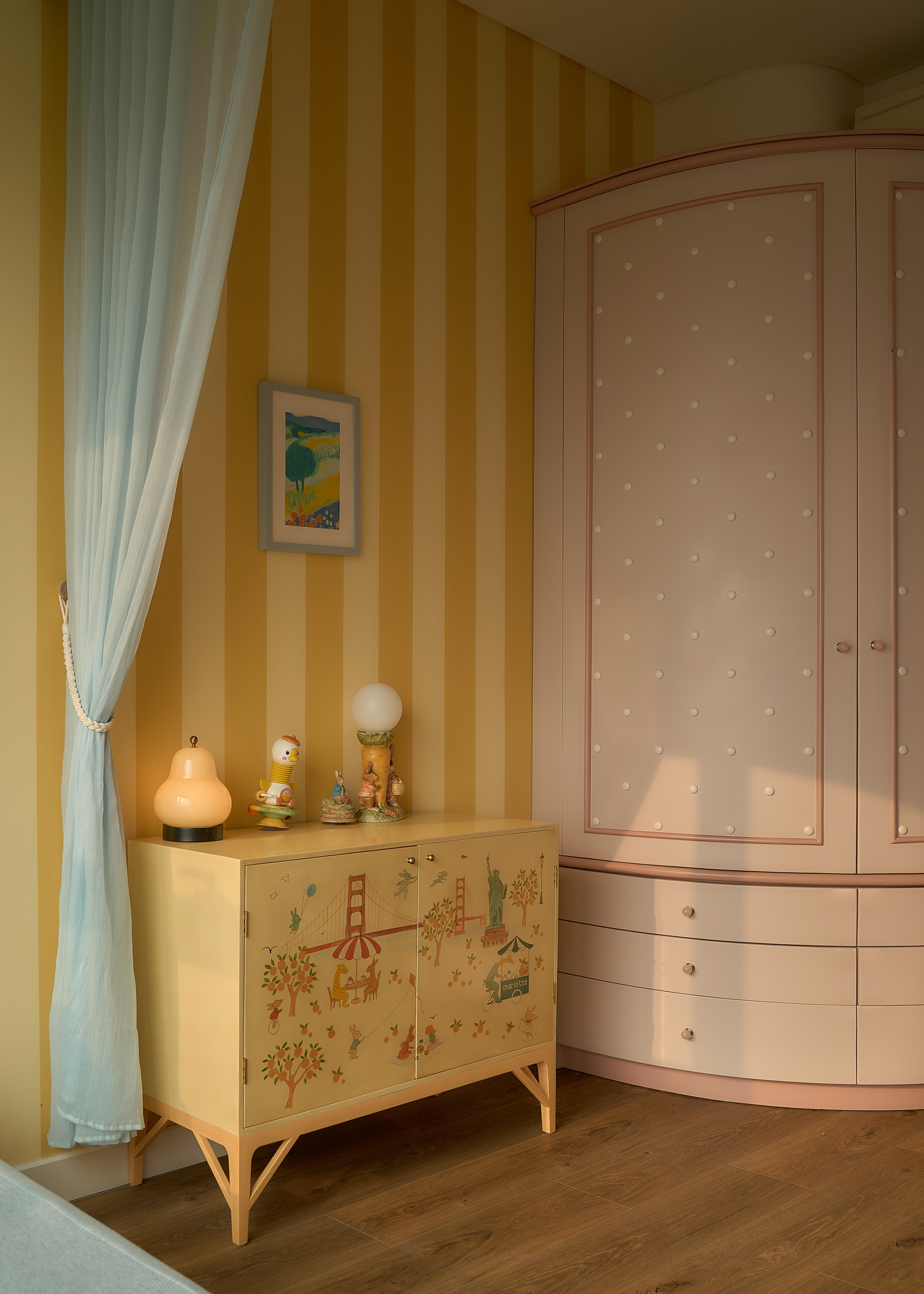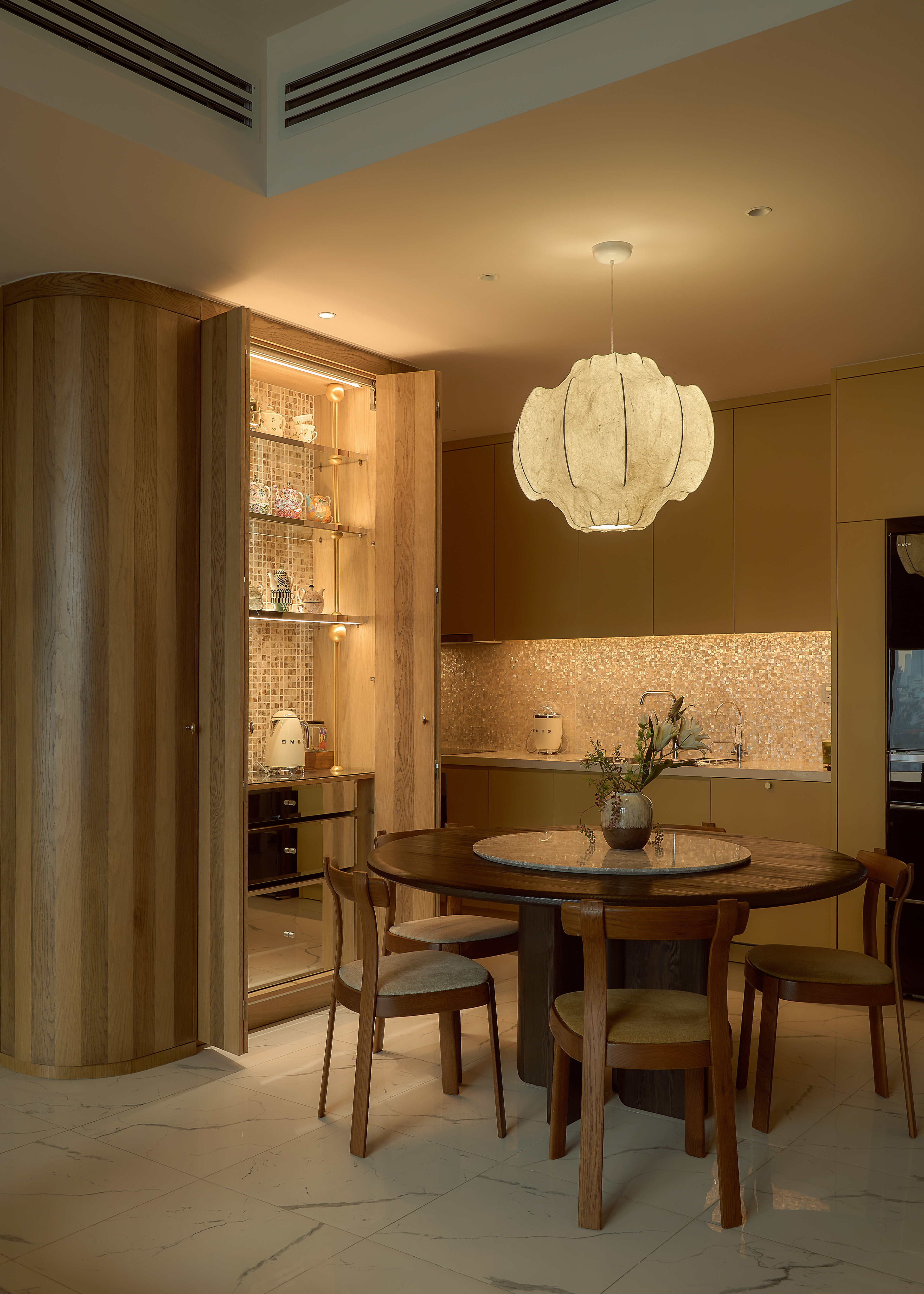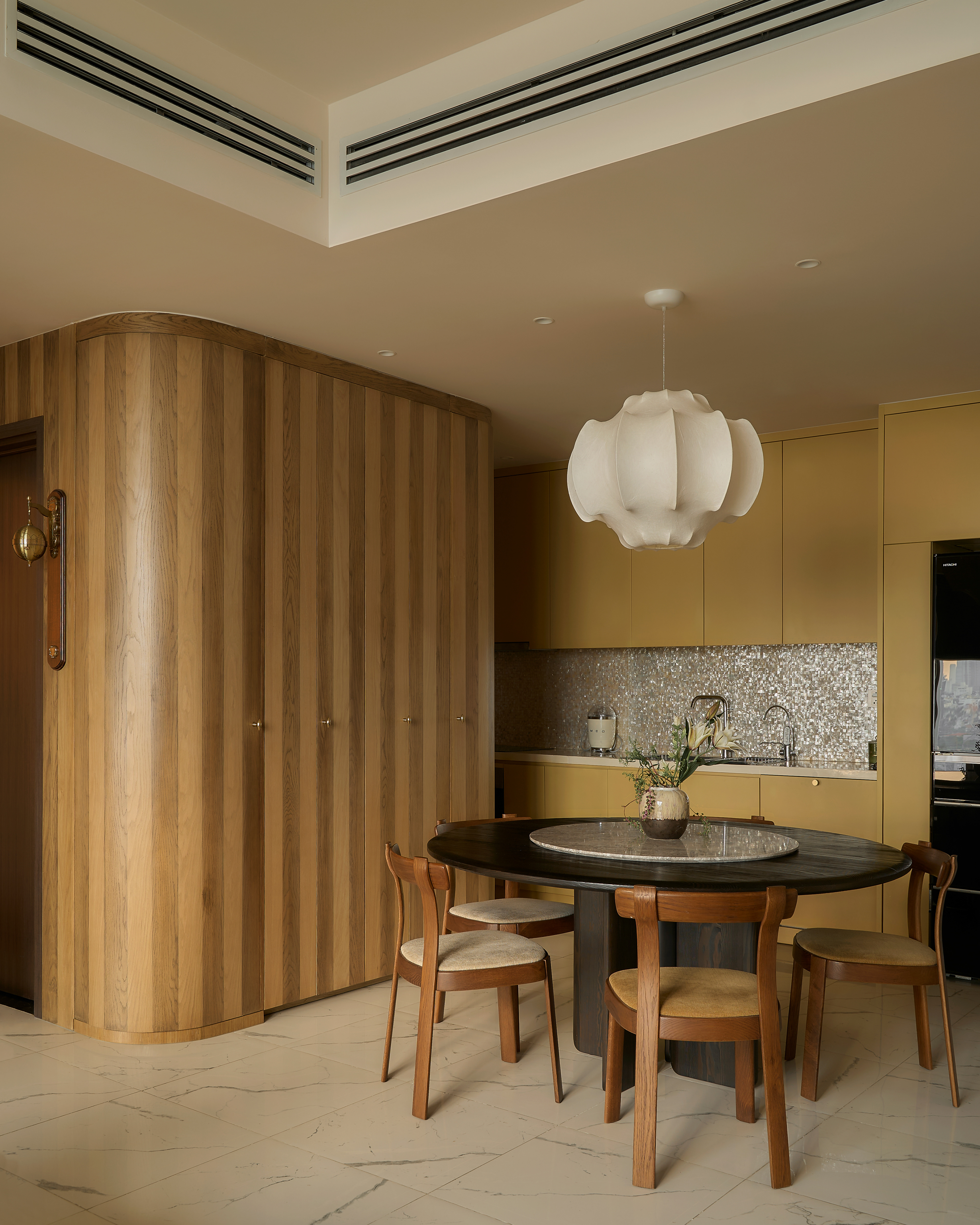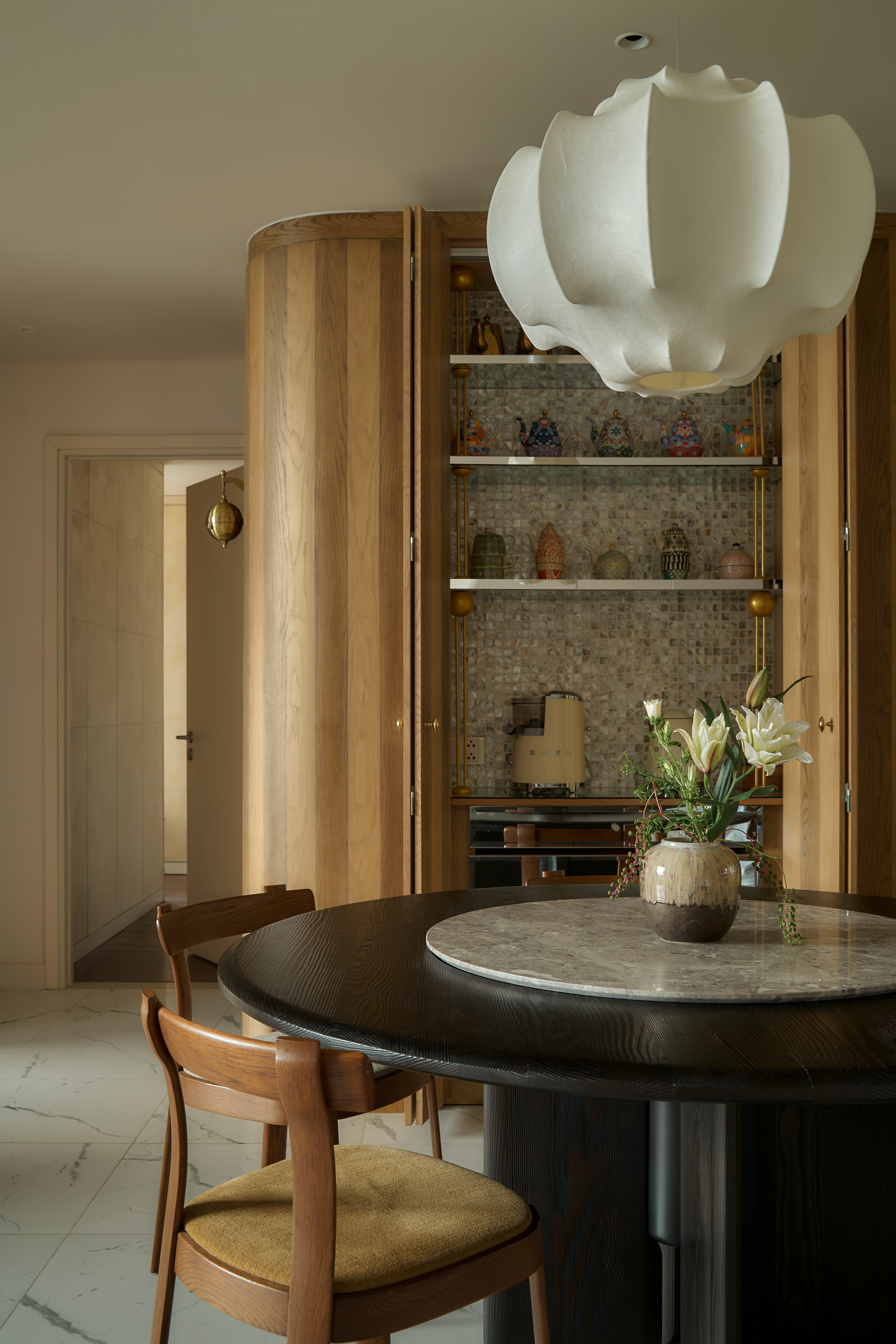 oh.hi studio approached the project within a context that required reconciling a family’s rapidly shifting daily life - especially with the arrival of a new member - and the inherent spatial limitations of the apartment. The rigid, pre-divided layout unintentionally became an obstacle, imposing overly clear boundaries on even the most basic functions. Therefore, intervening in the “communicative” walls became the primary strategy before aesthetic considerations were introduced. Curves and rounded edges replaced the original sharp corners, forming a system of adaptable partitions that shift with daily activities while simultaneously softening the spatial intersections within the home.