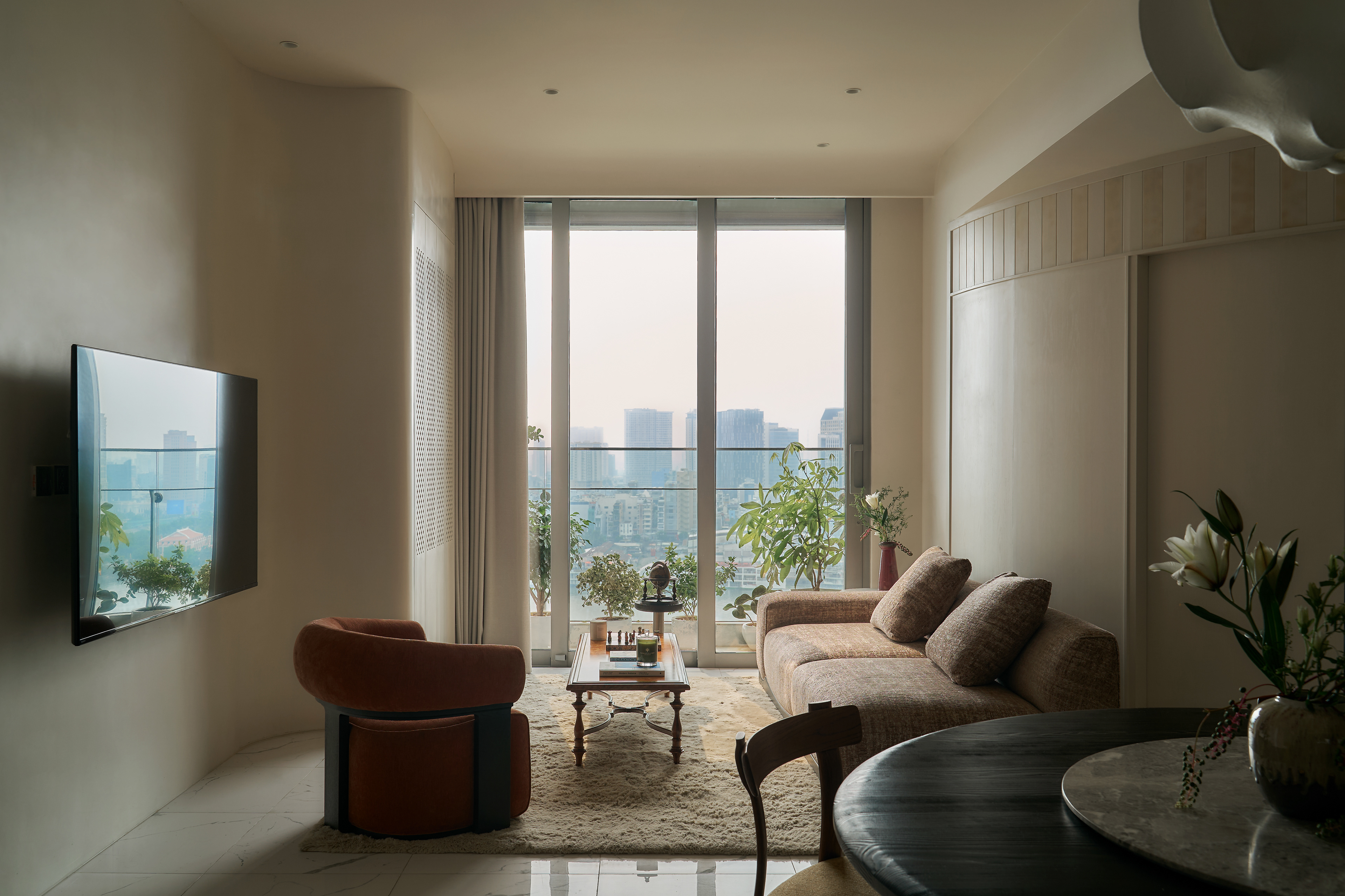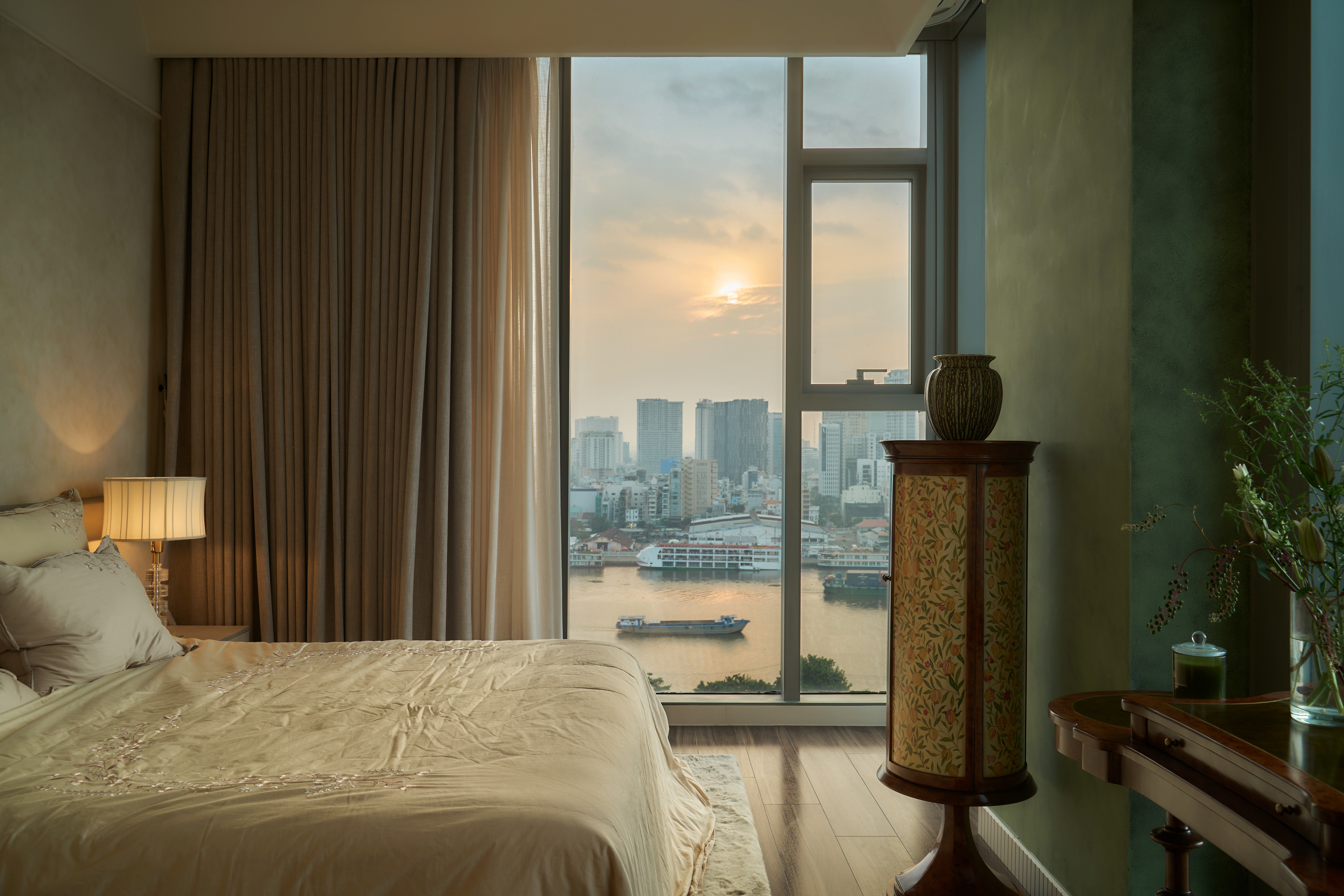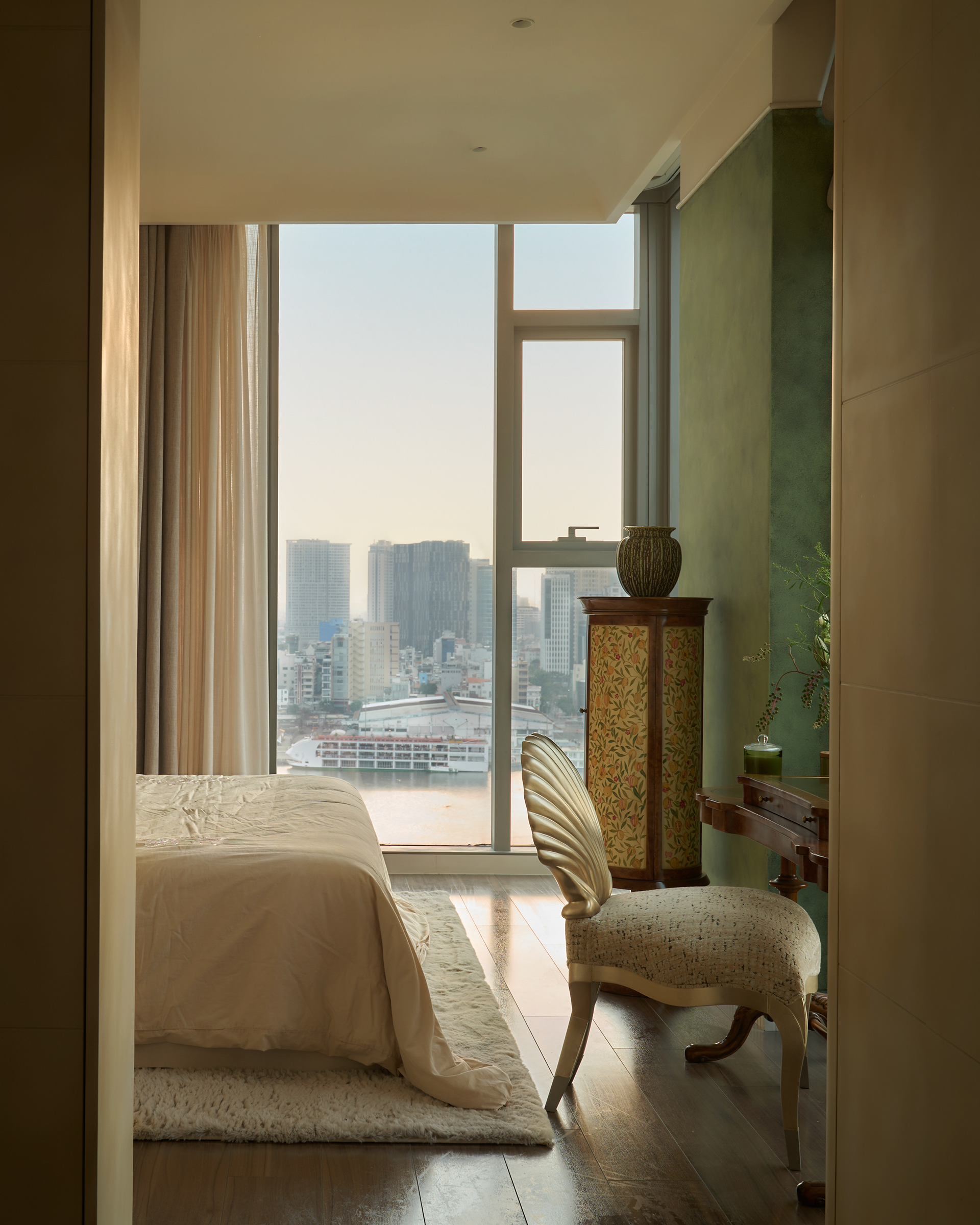 The anchor that stabilizes the openness of the layout is the round dining table with its deep wood tone, creating a visually grounded focal point that adds density to the overall composition, where most elements and colors lean toward brighter shades. The master bedroom is more secluded, divided into two parts through the strategic use of a wardrobe system arranged as a hallway - both directional and spatially partitioning without the need for solid walls. As a result, the visual field of the bedroom is refined, free from overwhelming cabinetry, and naturally oriented toward the valuable river view of the Saigon skyline. This organization allows the space to remain optimally streamlined while still reflecting the user’s refined, graceful lifestyle.