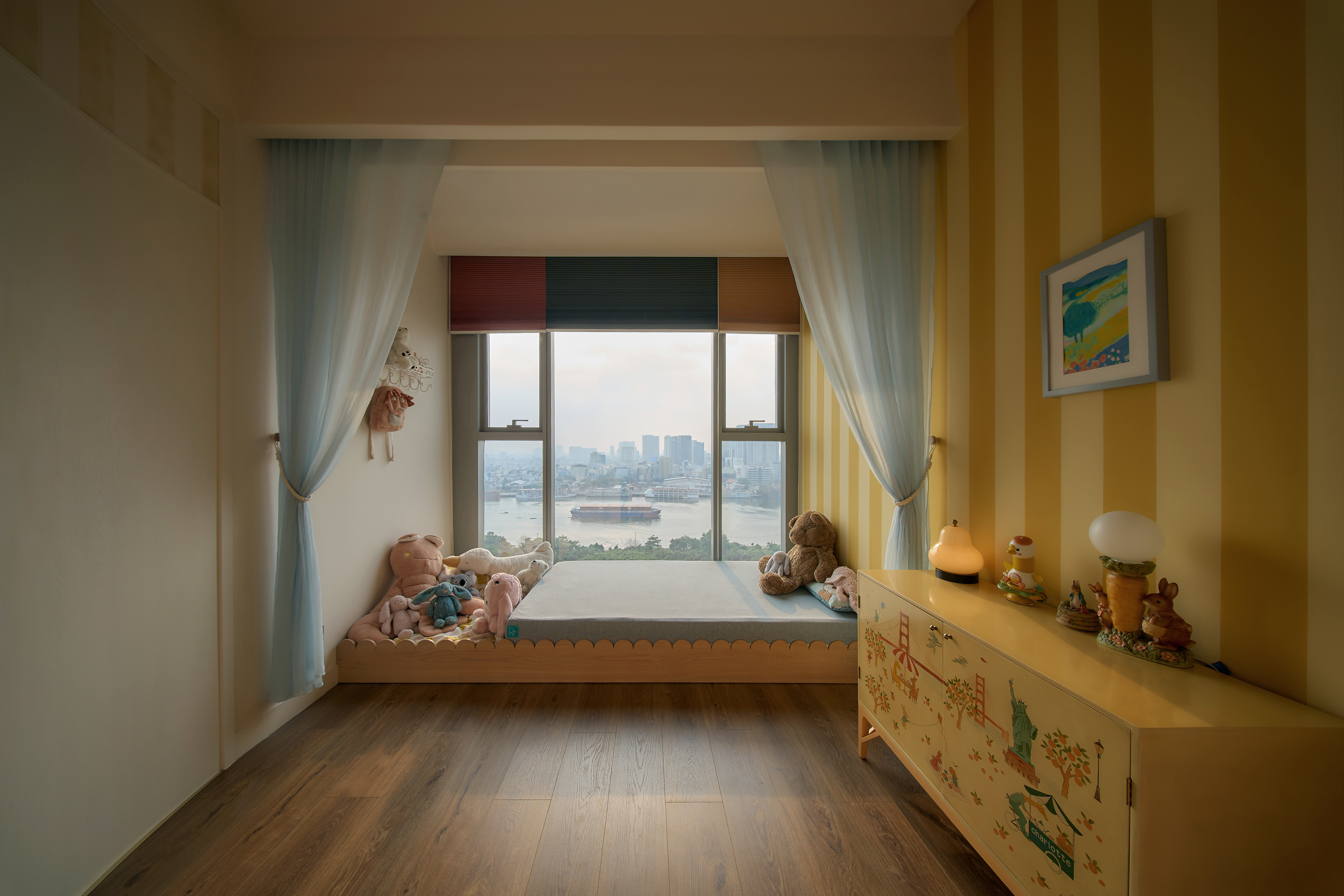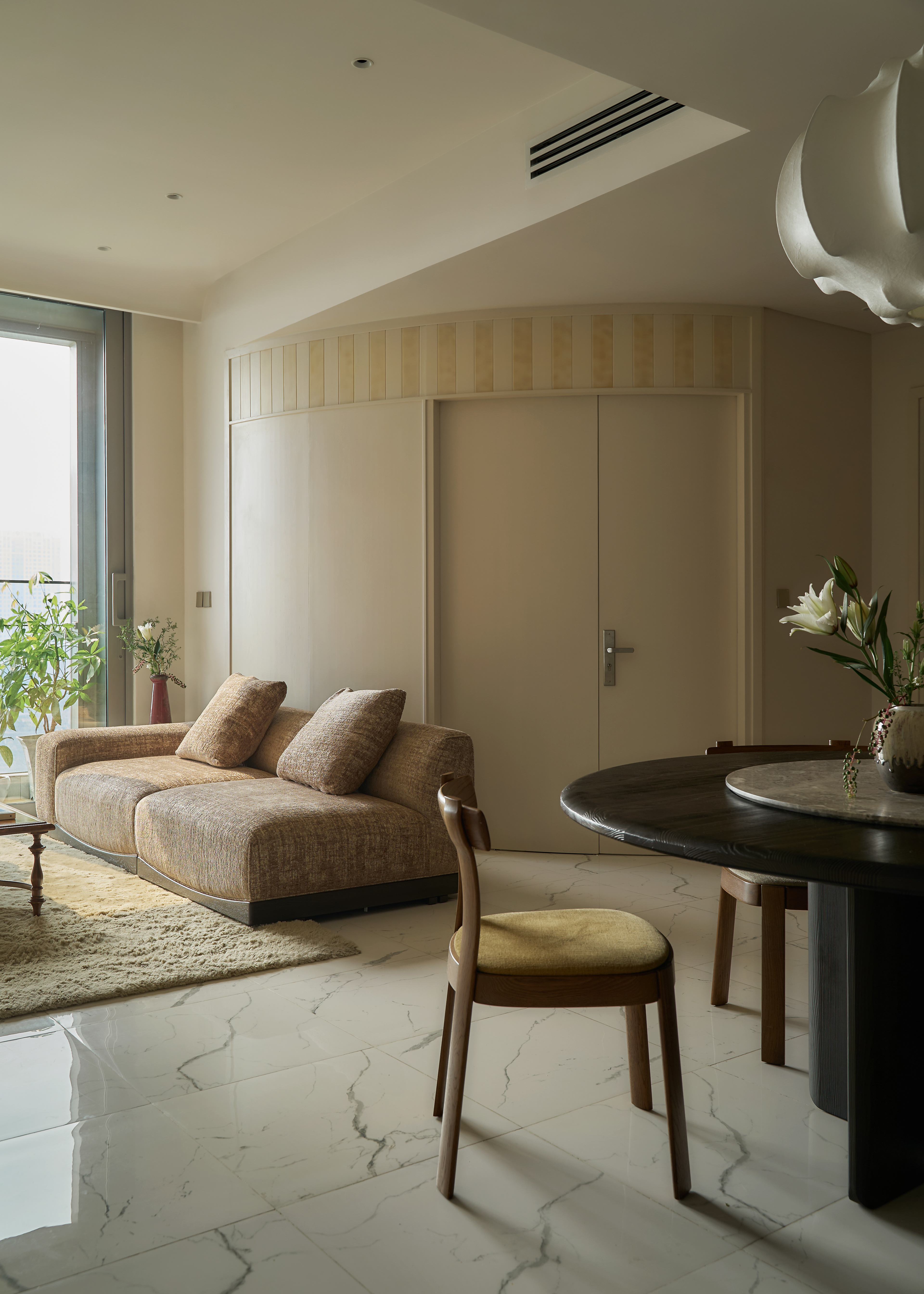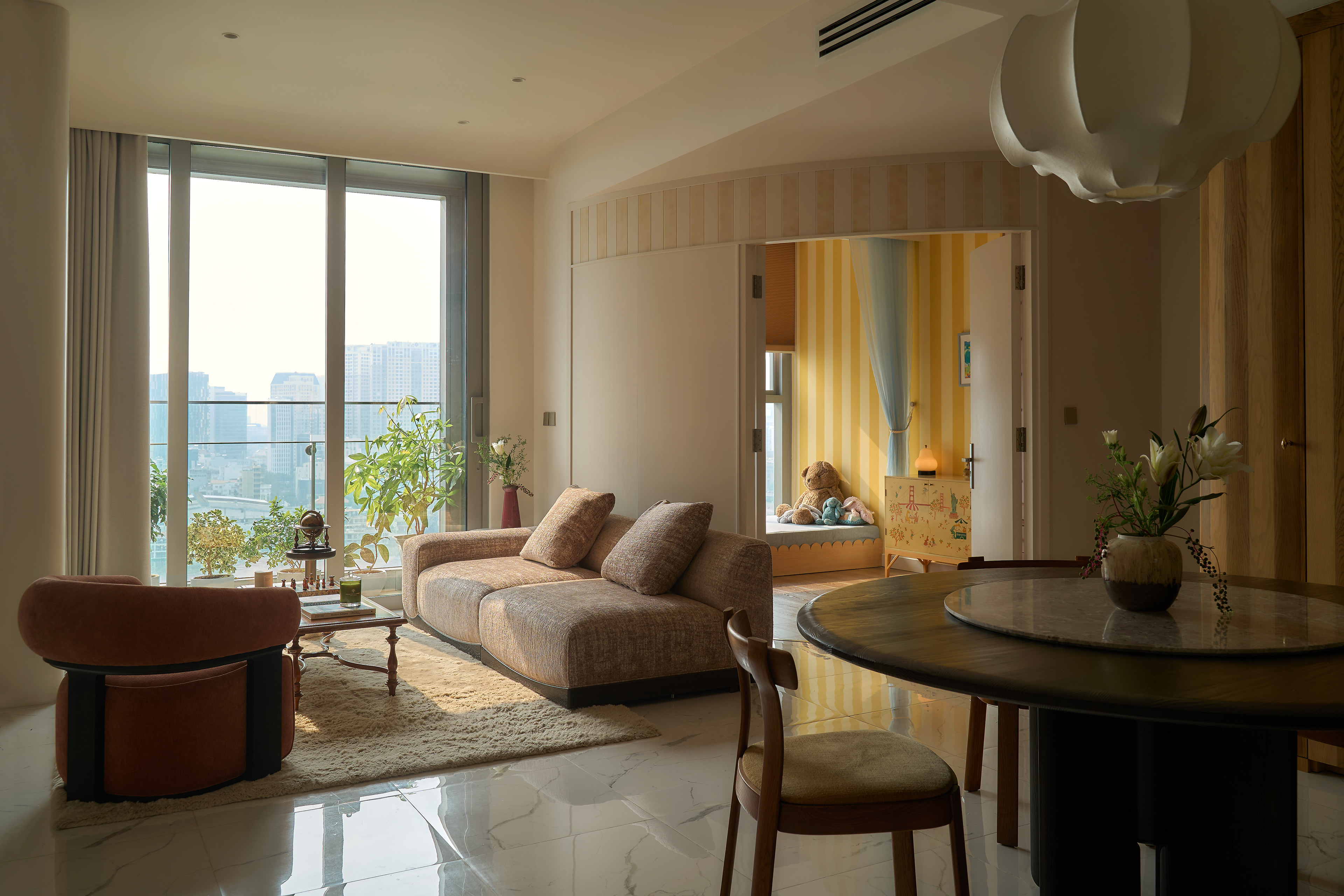 The anchor that stabilizes the openness of the layout is the round dining table with its deep wood tone, creating a visually grounded focal point that adds density to the overall composition, where most elements and colors lean toward brighter shades. The master bedroom is more secluded, divided into two parts through the strategic use of a wardrobe system arranged as a hallway - both directional and spatially partitioning without the need for solid walls. As a result, the visual field of the bedroom is refined, free from overwhelming cabinetry, and naturally oriented toward the valuable river view of the Saigon skyline. This organization allows the space to remain optimally streamlined while still reflecting the user’s refined, graceful lifestyle.