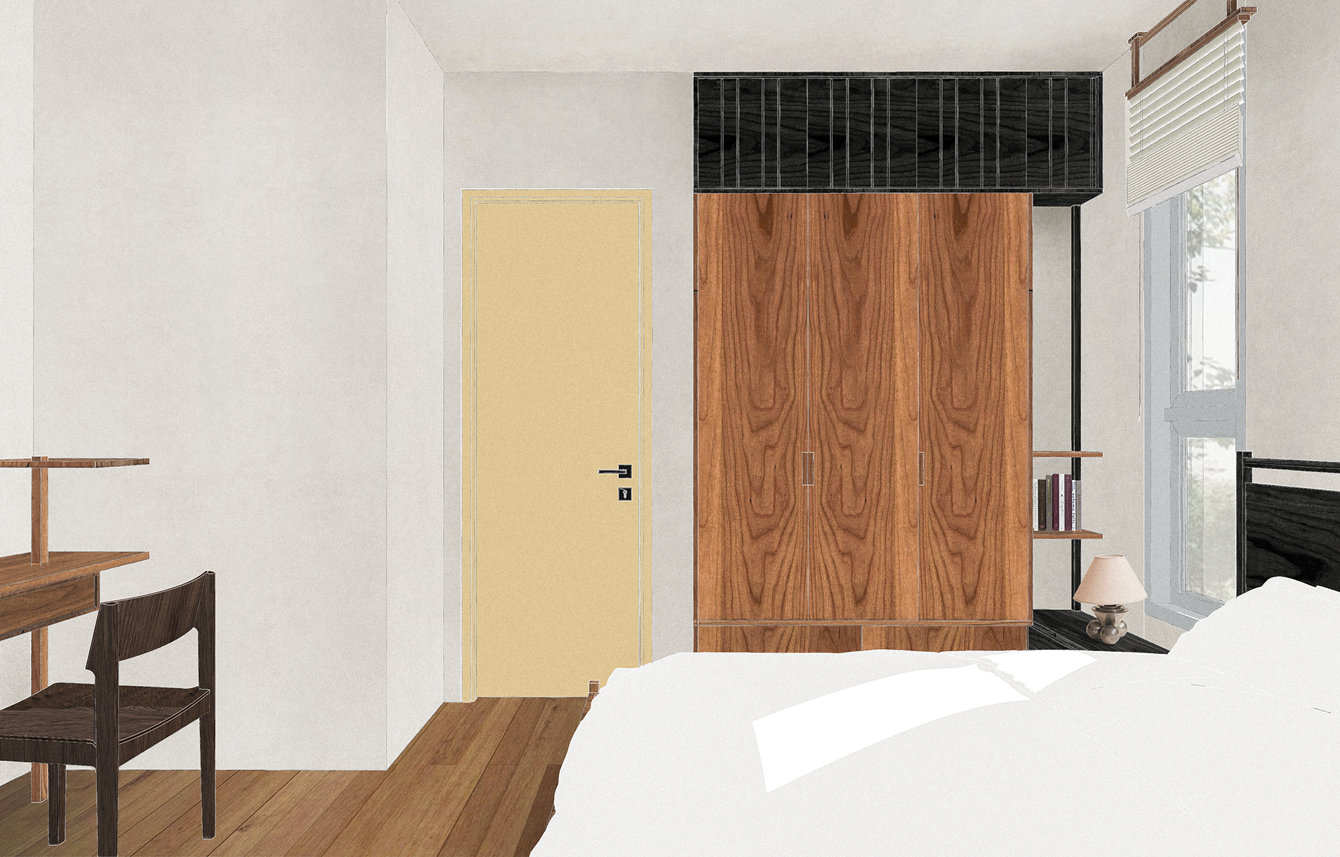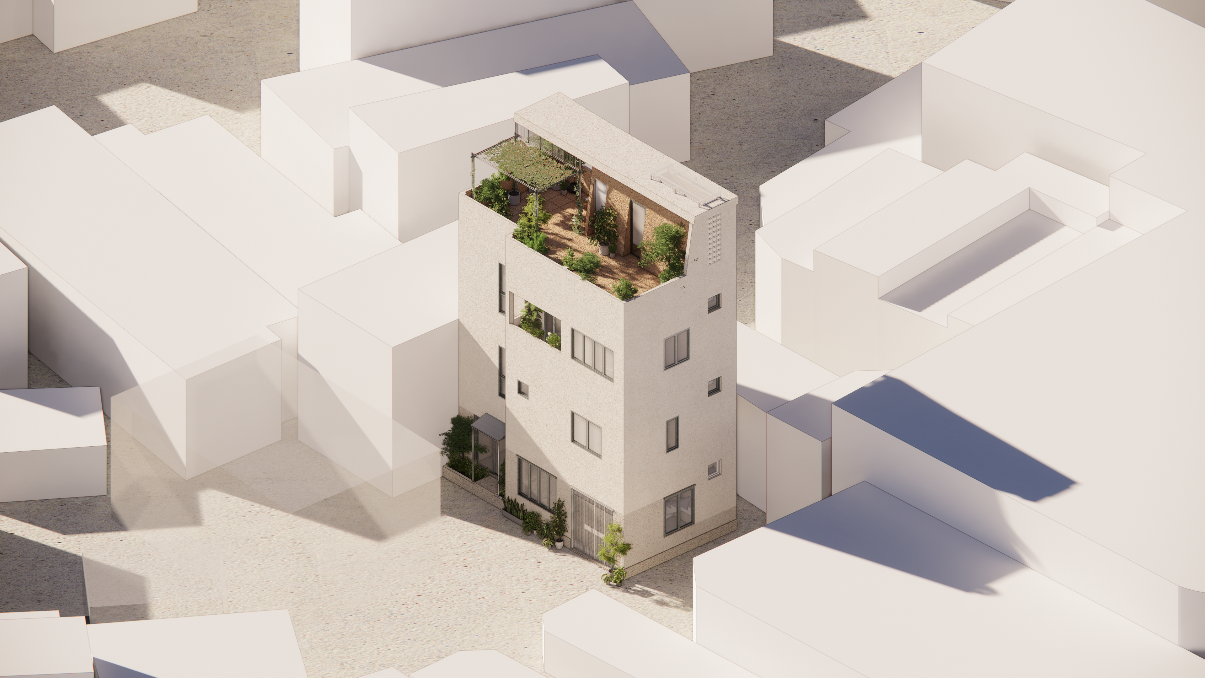 A building follows the shape of its plot and rises vertically as a simple box. Its windows are carved out purely for function, without any embellished storytelling layered on top.
